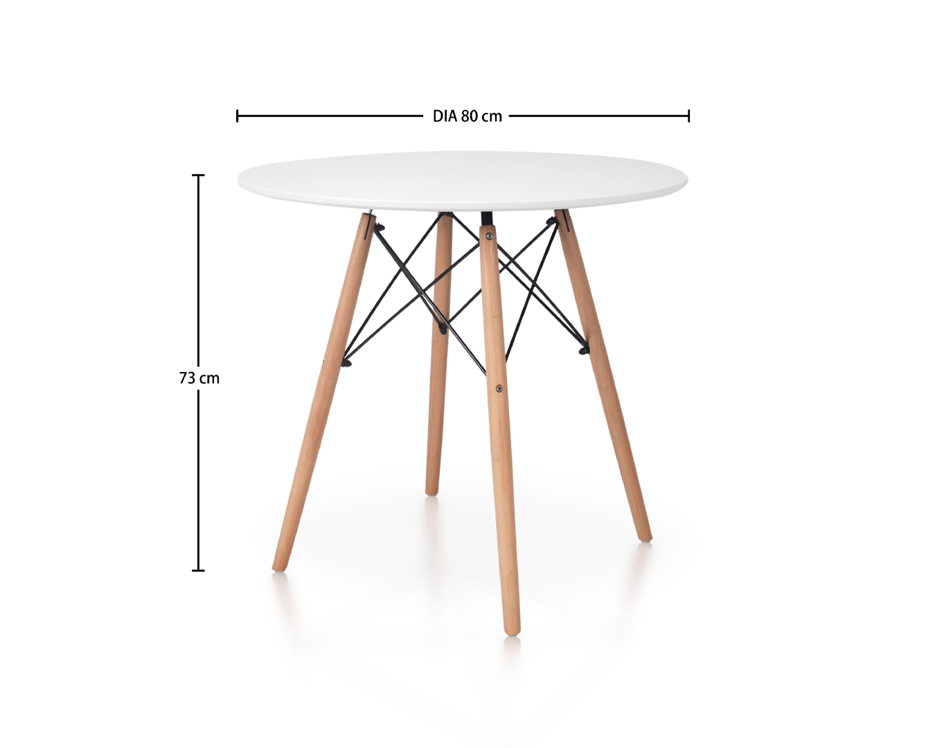 • Okrągły top stołu, wykonany z tablicy gęstości premium, oferuje nieskazitelną białą powierzchnię, która emanuje wyrafinowaniem i prostotą. Naturalne drewniane nogi zapewniają ciepły kontrast z białym stołem, tworząc zrównoważony i harmonijny wygląd. Czarna druciana rama łącząca nogi dodaje zarówno siły, jak i nowoczesnej estetyki, dzięki czemu ten stół jest wyjątkowym elementem w każdym pomieszczeniu.